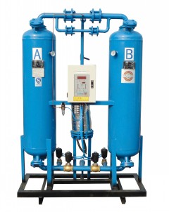 微熱再生壓縮空氣干燥機,綜合變壓吸附和變溫吸附之優(yōu)點,在常溫高蒸汽分壓下吸附(工作);在較高溫度,低蒸汽分壓下解析(再生),即吸附劑在吸附過程中吸附水份,在再生過程依靠高品質(zhì)再生氣(加熱干燥的空氣)的熱擴散和低分壓兩種機理的共同作用而得以完全清除。